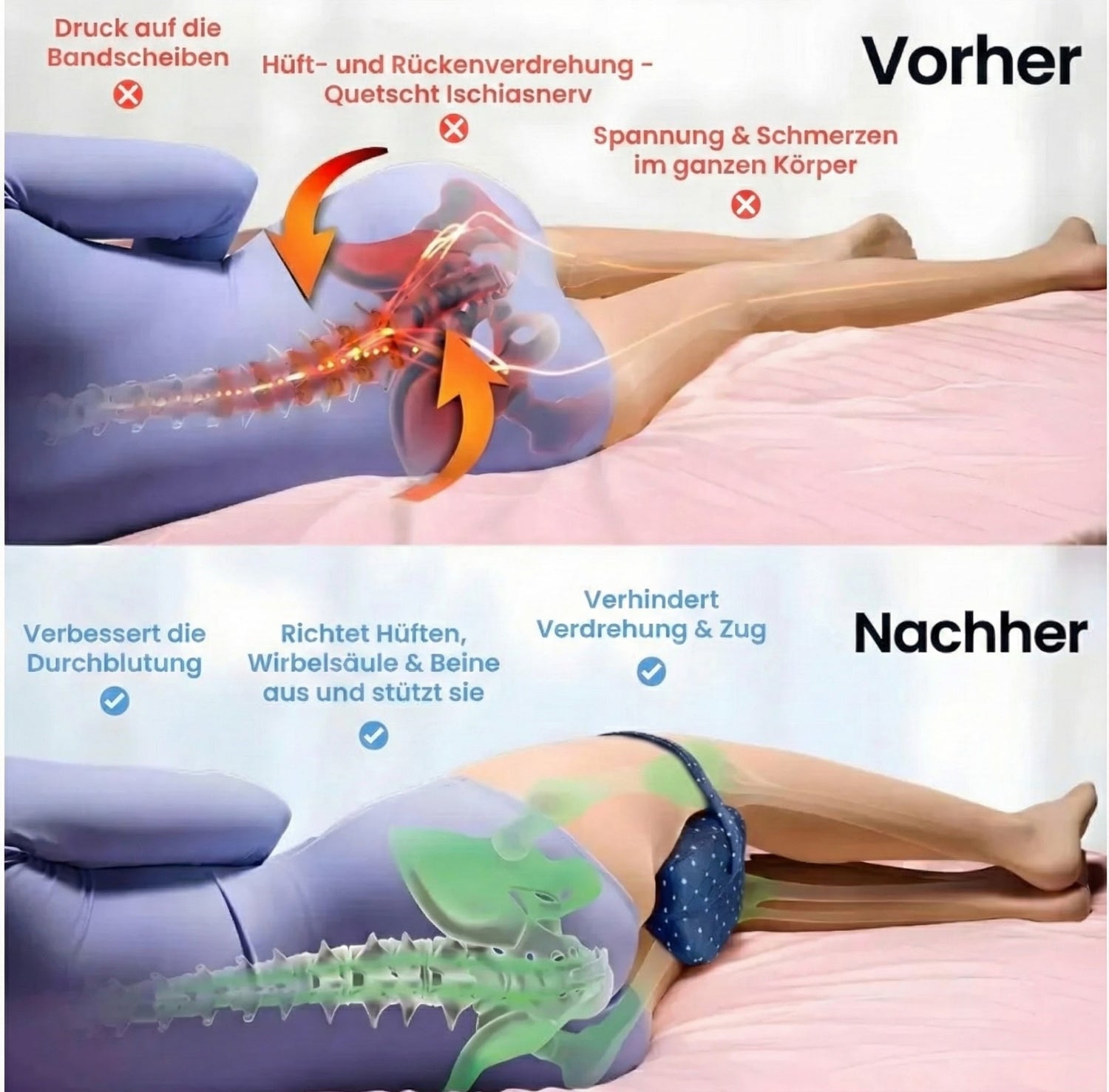 Dieses Bild zeigt, wie einfach die Lösung ist: Sobald Sie das Kissen zwischen die Knie legen, kehrt Ihr Körper in seine natürliche, neutrale Linie zurück. Die Durchblutung verbessert sich und der Druck verschwindet. Schenken Sie Ihrem Körper diese Entlastung.